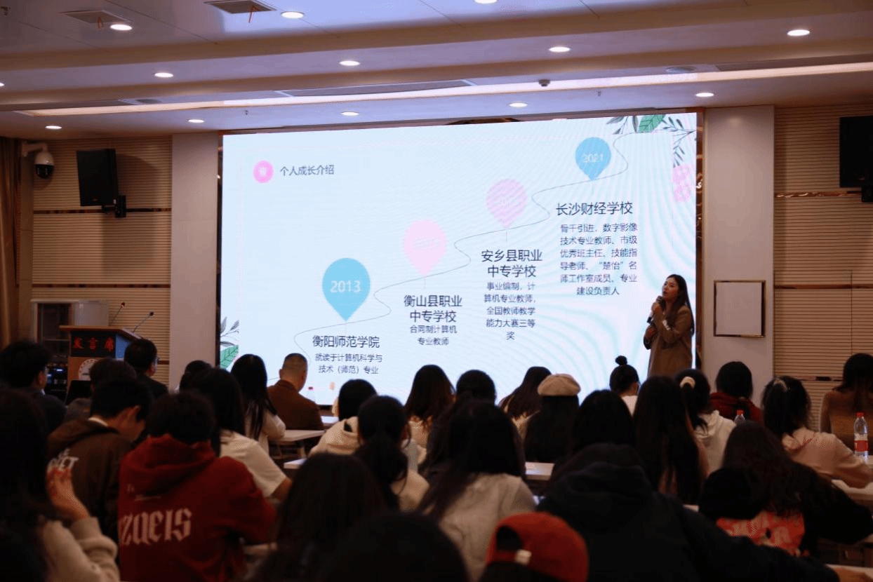随后,衡阳市船山实验中学办公室主任蒋颖洁、长沙财经公司教师严鑫紧扣“教书育人,知行合一”分享了个人经历、专业发展与精神成长等内容。她们结合中学、中职信息技术教育行业的大背景以及个人多年工作的经历,向现场同学们展示了真实而火热的从教生涯,同时以自身从事信息技术教学专业研究的经历与目标为同学们提供了未来教学和科研职业生涯新的思路。