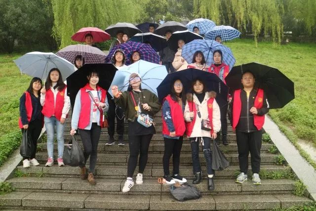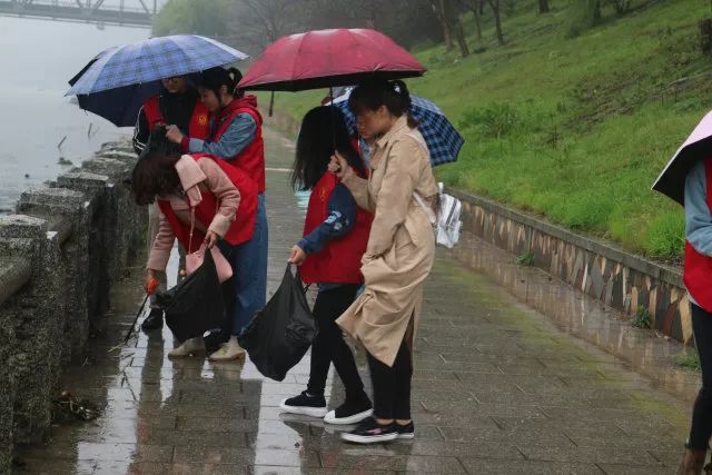 上午9点多,天还下着小雨,全体员工党员身穿红马甲,手持钳子、垃圾袋,两两一小组沿着江边的人行道拾捡江边的纸巾、果皮、烟头、食品袋等垃圾